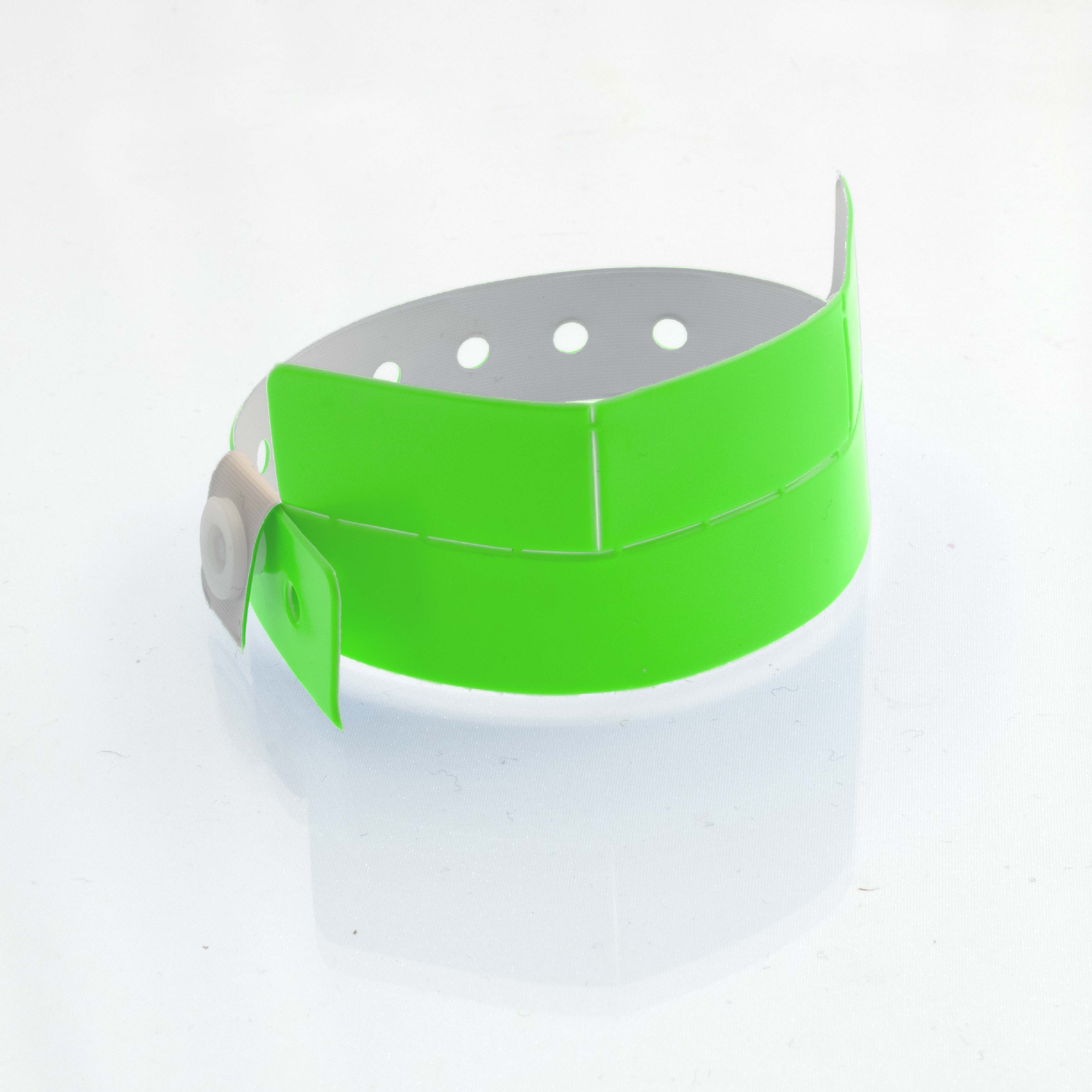 Bracelet en vinyle indéchirable et non transférable, résistant à l’eau. Pression plastique empêchant la réutilisation.